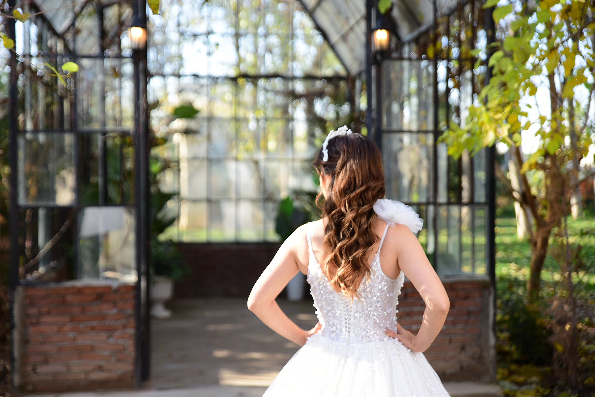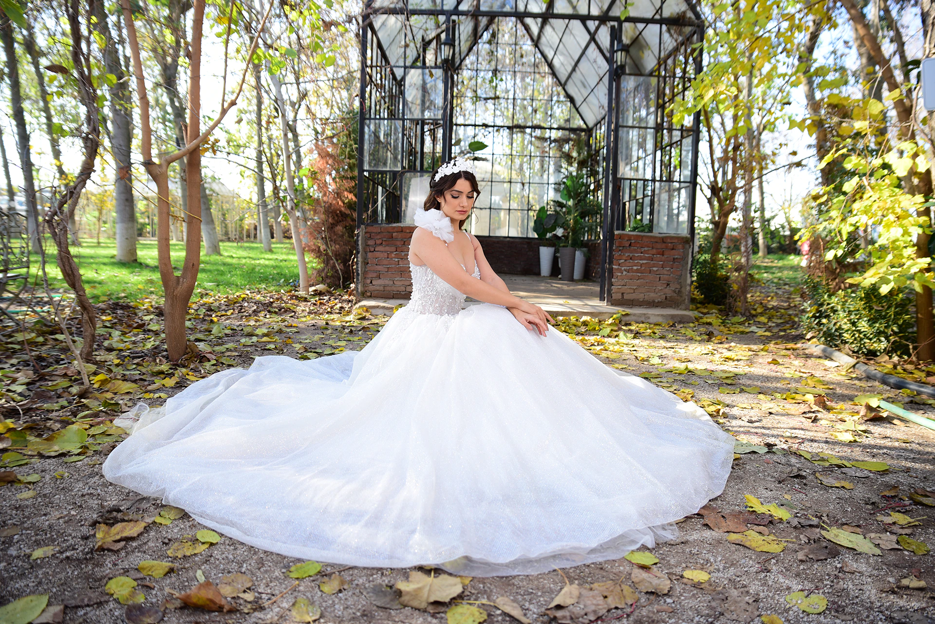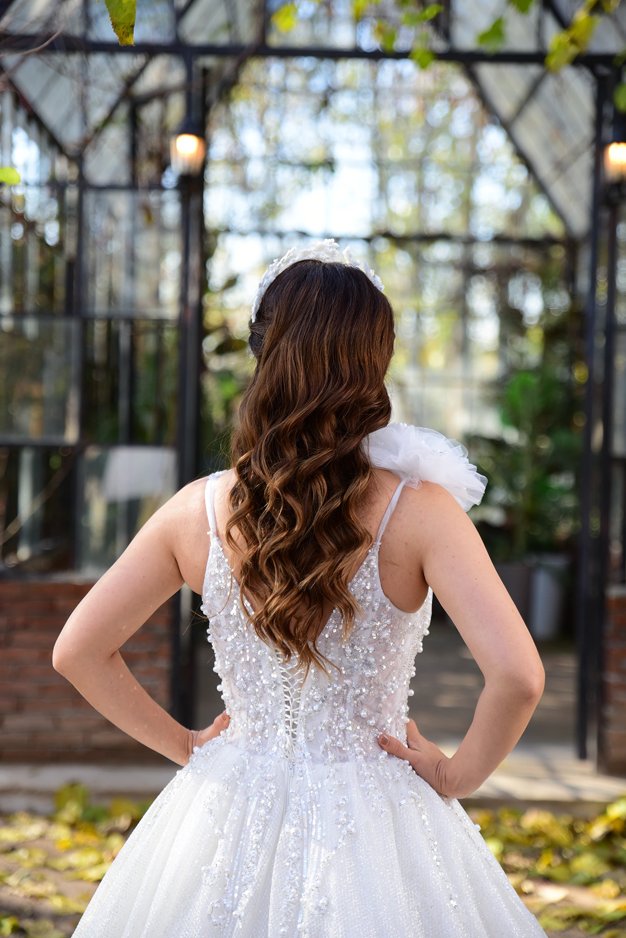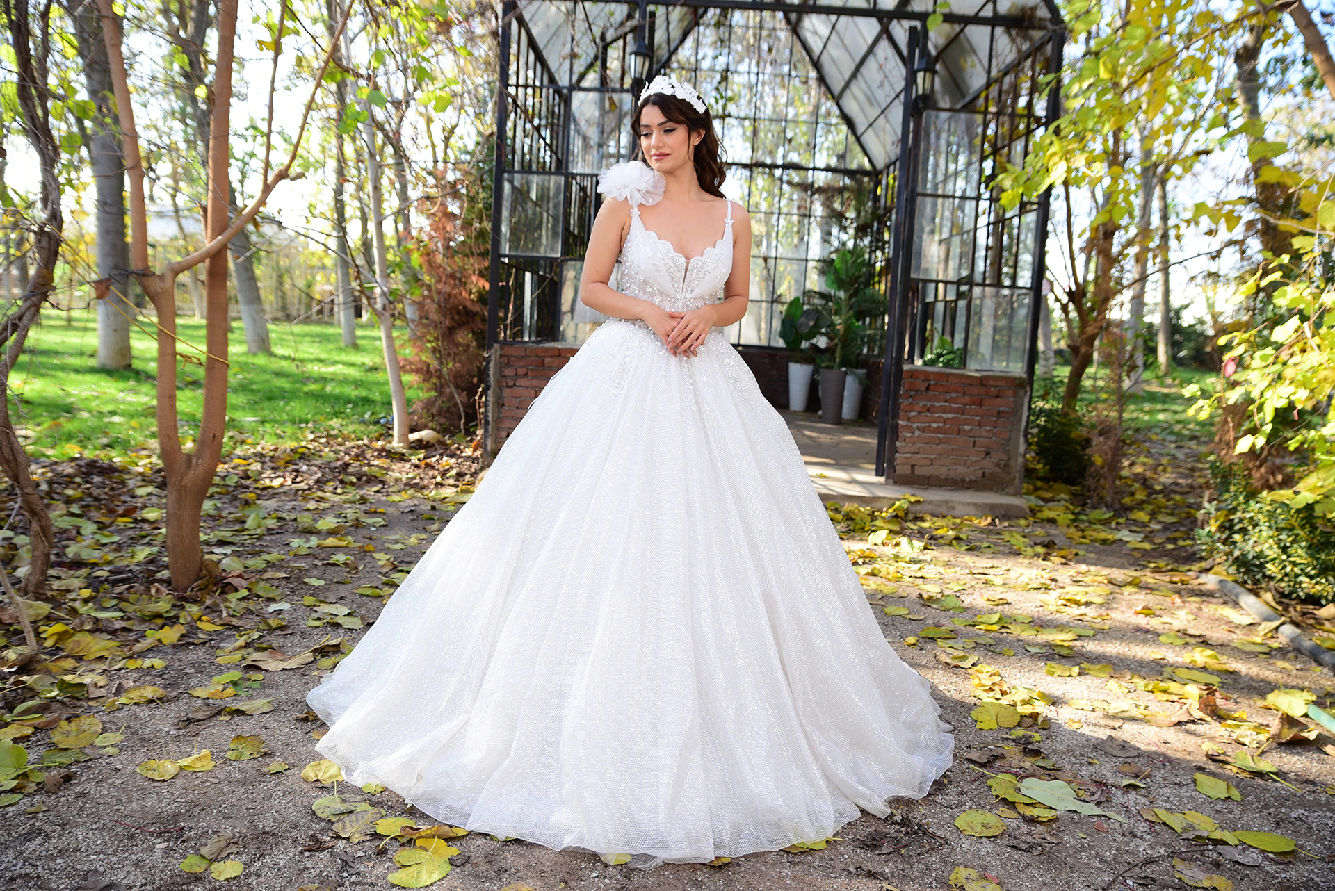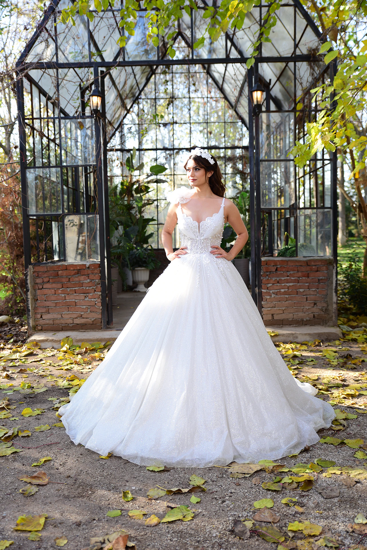 Zarif duruşu ve ihtişamlı detaylarıyla dikkat çeken bu özel dikim gelinlik, kendinizi adeta bir prenses gibi hissetmeniz için tasarlandı. Geniş etek kesimi, dantel işlemeleri ve ince işçilikle süslenmiş detayları, görkemli bir duruş sergilerken, hafif kumaşı gün boyu konfor sağlar. Uzun duvak ile tamamlandığında masalsı bir atmosfer yaratan bu tasarım, ihtişamı ve romantizmi bir arada sunarak özel gününüzde unutulmaz bir iz bırakmanızı sağlayacak.